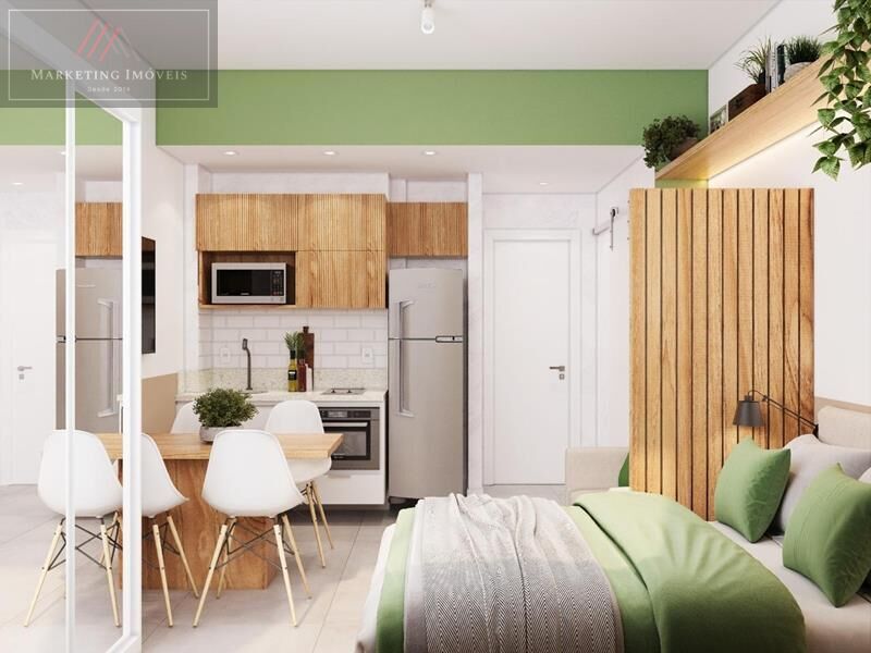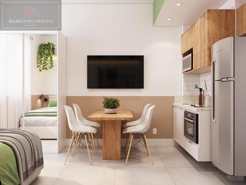 22m², sala com sofá, mesa de jantar e split; cozinha integrada com armários planejados, forno embutido a gás e cooktop de 2 bocas; quarto integrado com cama box e armário; banheiro com acabamentos modernos, blindex, nicho e lavanderia integrada. O imóvel é totalmente mobiliado, pronto para morar ou investir. Isento de IPTU. Documentação (RGI) tudo ok.